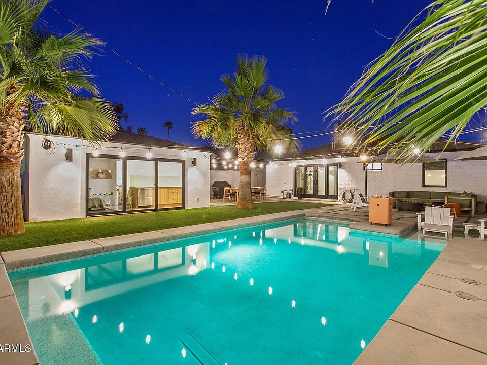 This meticulously remodeled c.1953 brick ranch is the perfect blend of laid-back elegance and earthy modern elements. Talk about location, location, location-the home is set on a North/South facing lot opening directly up to Coronado Park, in the heart of the eclectic Coronado neighborhood. A true architectural standout, the main home and guest house harmonize modern design with timeless materials, offering a lifestyle that feels both curated and effortless. The curb appeal is dialed in with desert-adapted landscaping, a crisp white brick facade with modern black accents and a classic Hollywood drive. Step inside and feel the peace: organic textures, a warm palette and natural light define the interiors. Designed with purpose, the wide-plank Stuga Danish hardwood floors, large-format porcelain tile and soft white walls set a clean backdrop for the home's character-rich featuresarched doorways, brick fireplace with wood hearth, corner butt joint windows and perfect vignettes framed throughout. The living room is a welcoming and intentional gathering space. Located off the living room sits a multi-purpose room that opens up to the rear yard, offering flexible space for formal dining, home office, play room, sitting room...you name it.