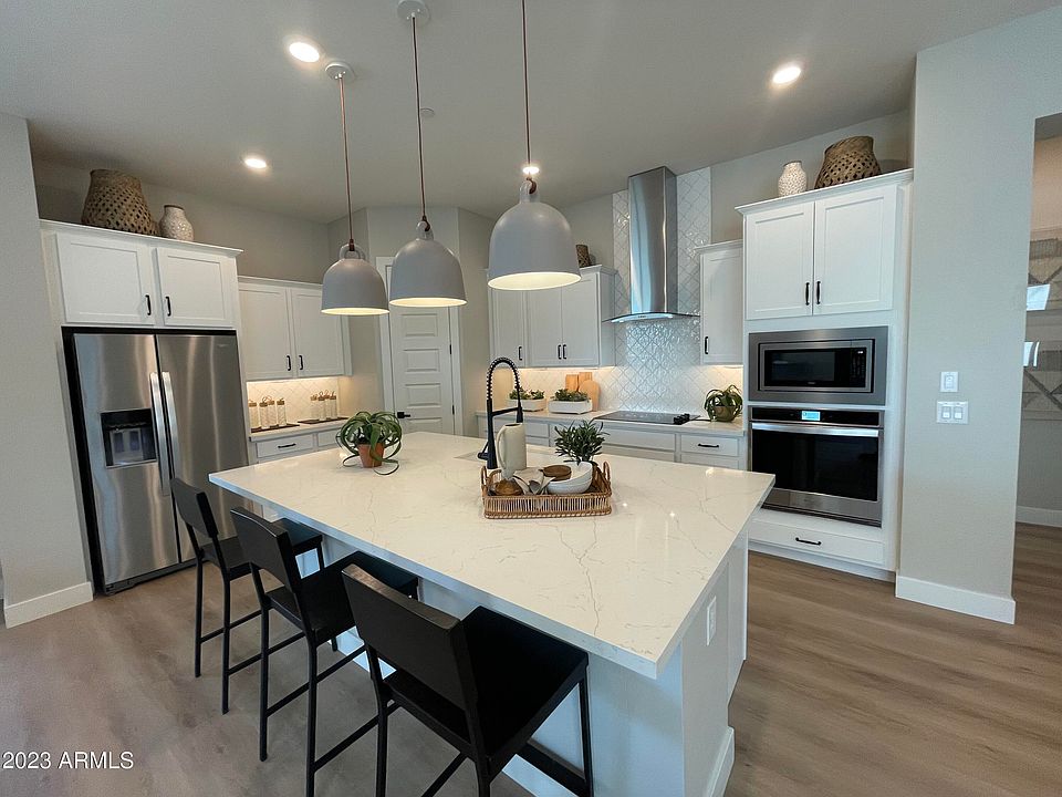 The Model Home is for Sale at The Estates at Lamb Lane in Gilbert, a private gated community. SPECIAL OFFER!: Seller, through seller's preferred lender, is offering an interest rate at 4.99%. Call for further details. Be captivated by this Model Home with meticulous design and impeccable upgrades. Single-level layout offers a blend of modernity and comfort with a sprawling great room and dining area with 10-foot ceilings throughout. Indoor and outdoor living through two impressive 12-foot multi-slide doors connecting the interior to the rear yard and a charming side yard courtyard. The owner's bedroom serves as a private sanctuary, with a sliding glass door opening to the extended covered patio. This is not just a home; it's a lifestyle defined by luxury and exclusivity. A Must See..