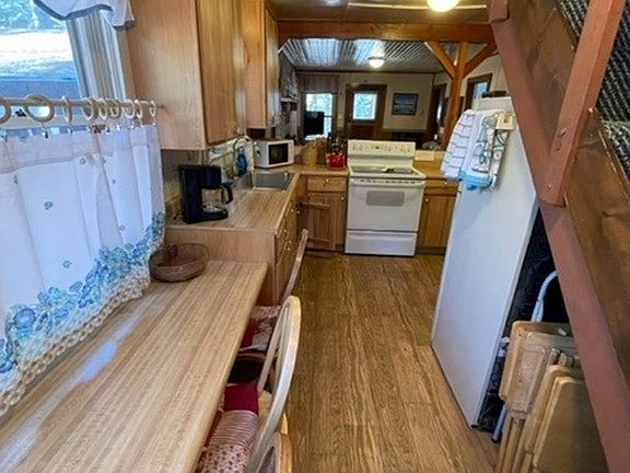 Peaceful comfort surrounds you as you step onto the front porch which has been the host to many a warm evening book reading or gab sessions as your family and friends wander about the fenced front and back yard all set up for your outdoor entertaining. Step inside and be greeted with the warmest of rock hearth & gas fireplaces & into the charm of this mid-century roomy cabin designed with knotty pine, wainscoted paneling and ceilings. Main floor hosts two bdrms, all new marble step in shower to delight, step saver kitchen and eat in counter. As well as the laundry & utility room in the enclosed back porch. Upstairs leads to the dbl lofted area which has plenty of room to sleep in. Great location central to dining, shopping, grocery and all essential services but best of all jump on the bike or head out to the trails! The home can be unfurnished for a long term rental.