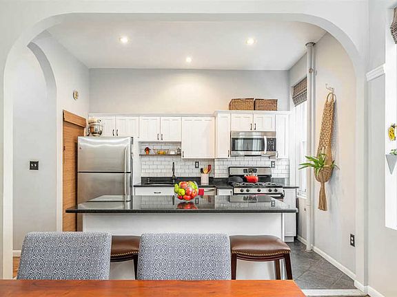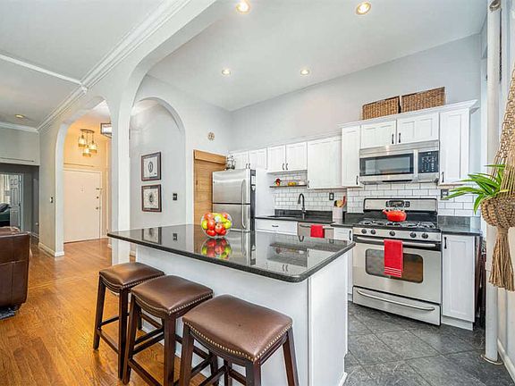 This Uptown 2 Bedroom plus Den Condo is Bursting with Charm and Original Details! You will be delighted with the tasteful updates that have been added to this unit, just one flight up in this well-maintained building. The open concept Living Room/Dining Room area features 11-Foot Ceilings, Original Marble Stone Mantel, Crown and Wall Molding and Beautiful Arched Entry Ways. The Kitchen is a true delight with a Massive Center Storage Island, Granite Counter Tops, Stainless Steel Appliances, Classic Subway Tile Back Splash and Pantry. The Master Bedroom is bright and spacious with an additional Stone Mantel. The Den is very roomy and offers many options for use â home office, nursery, or 3rd Bedroom. Other wonderful features include recently Renovated Bathroom, Hardwood Floors throughout, 4 Large Closets with 2 boasting California Closet Storage Systems, 4 Roomy Overhead Storage Cubbies, Entry Way Stroller Storage, New Windows, New Light Fixtures, First Floor Laundry room shared with only one other unit! Prime Location â Close to Trader Joes, Parking Garages, Ferry & Bus to NYC, and tons of amazing Restaurants and Shops.