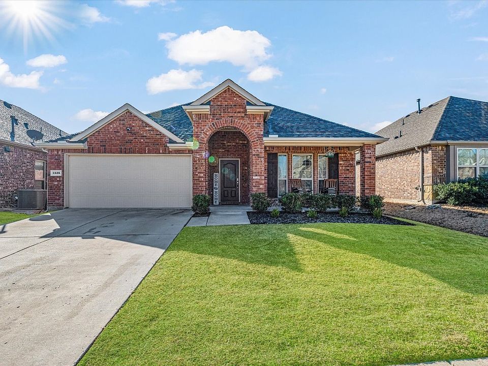 Beautiful spacious home located in the desirable master planned community, Anna Town Square. The large gourmet kitchen is the center and highlight of this home with granite counter tops, white cabinetry, immense counter space, walk-in pantry, 5 burner gas range, and stainless steel appliances. Home boasts 3 bedrooms, 2 bathrooms, a private study, 2 car garage with upgrades including engineered hardwood flooring, extended 32’x10’ concrete back patio, fresh paint, new 2” blinds, epoxy painted garage floor, added storage in attic, 9” insulation added to the garage, new light fixtures, and more. Enjoy relaxing on the front porch or one of the community amenities such as the pool and playground. Refrigerator, Washer, Dryer negotiable. Curtains and curtain rods through out home, Living room and garage TVs, and TV mounts all staying! Seller willing to offer Concession for buyer rate buy down with strong offer!