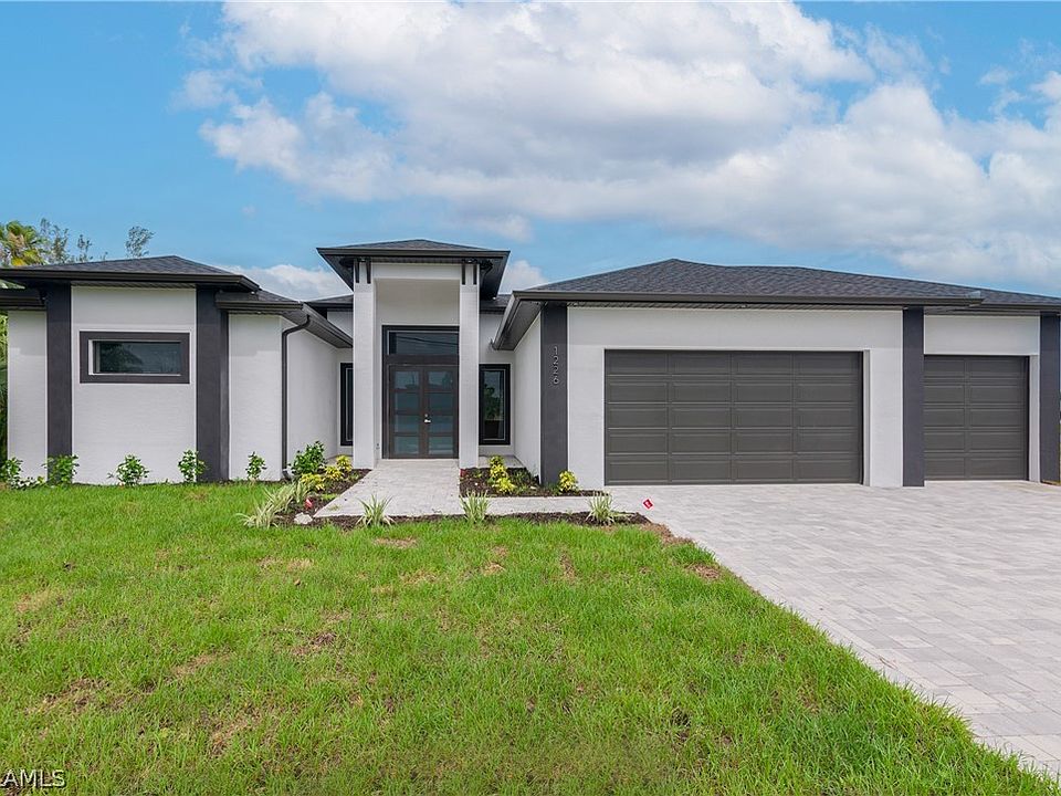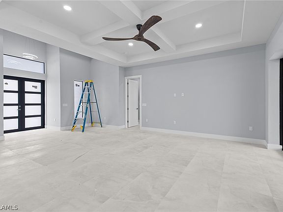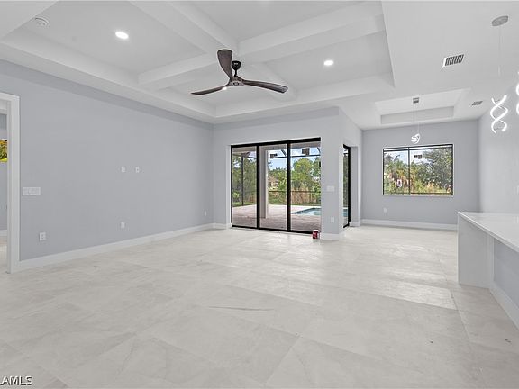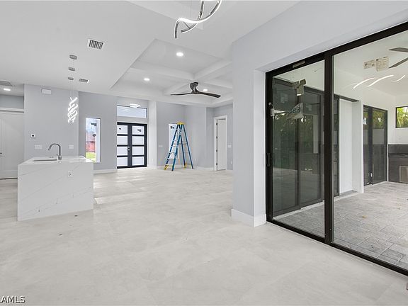 New Construction. SW Cape Coral waterfront pool home. Spaciously designed with 3 bedrooms, 3 bathrooms and a 3 car garage. The home features a 14'4 impact double door entry, open floor plan, 9'4 coffered ceilings, 8' interior doors, and imported tile flooring throughout. The kitchen boast stainless steel appliances, an oversized quartz waterfall island, finished with a single bowl stainless steel sink. The kitchen and all bathrooms, accented with quartz countertops, are fit & finished with soft close drawers and cabinets, and accented with beautiful pendant and wall lighting. The guest/pool bath opens onto the paved pool deck and screened lanai. The exterior lanai features an outdoor kitchen complete with gas grill, running water, and mini fridge, extending the outdoor living space on this fresh waterfront property.