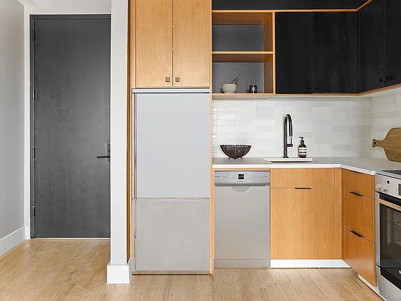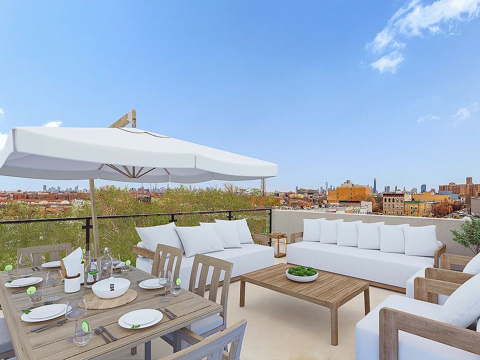 Welcome to 1226 St Marks Ave, the premier new development in Crown Heights. With intuitive layout and modern convenience, this building provides an open format that utilizes clean lines and floor-to-ceiling windows. All units have a quiet, energy efficient heating/cooling system, their own 48-gal hot water heater, and washer/dryer hookups. Through sophisticated design, this building offers rich enjoyment in an expansive living space. 4A, the penthouse, is a 2-bedroom, 1-bathroom apartment. Enjoy the sun from the north-facing balcony or entertain guests from the spacious terrace on the upper floor. Spanning 450 sq ft, the nearly 180° city views are spectacular. The 5-inch white oak floors showcase the long, open space, taking advantage of the extra length this building has to offer. A German kitchen, filled with every convenience including custom cabinetry and plenty of storage for essentials, will meet all your cooking needs. It's equipped with sleek countertops, a white tile backsplash and a suite of high-end stainless-steel electric appliances including dishwasher and microwave. The bedroom has a reach-in closet and is spacious enough for a king-size bed. The upper level can easily accommodate a bedroom set or function as an office looking out on the sun-drenched terrace. Designed with an eye to detail, the bathroom is encased with cool, grey tile, has a radiant heated floor, oversized LED mirror, a Fine Fixtures deep soaking tub and dual sink Blossom vanity. 1226 St Marks sits just a block away from St Johns Park with its onsite rec center. The building is located near the Crown Heights North Historic District with 19th century revival architecture, listed on the National Register of Historic Places. Local C and A express trains are within?close proximity?as well as the 2, 3 and express 4 trains. All at the two Utica Ave stations. Complete offering terms are in an offering plan available from File No. CD200059