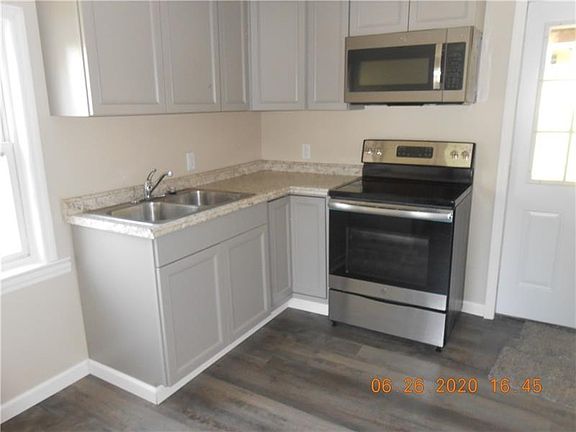 Two story 2 bedroom home that has been remolded including the following new items, dry wall, kitchen cabinets, flooring, trim, electrical panel, electrical entrance, plumbing, hot water tank, and lighting. The sale includes a new built in microwave and a new electric stove. The exterior aluminum siding has been freshly painted. The property has off street parking and two sheds in the back yard.