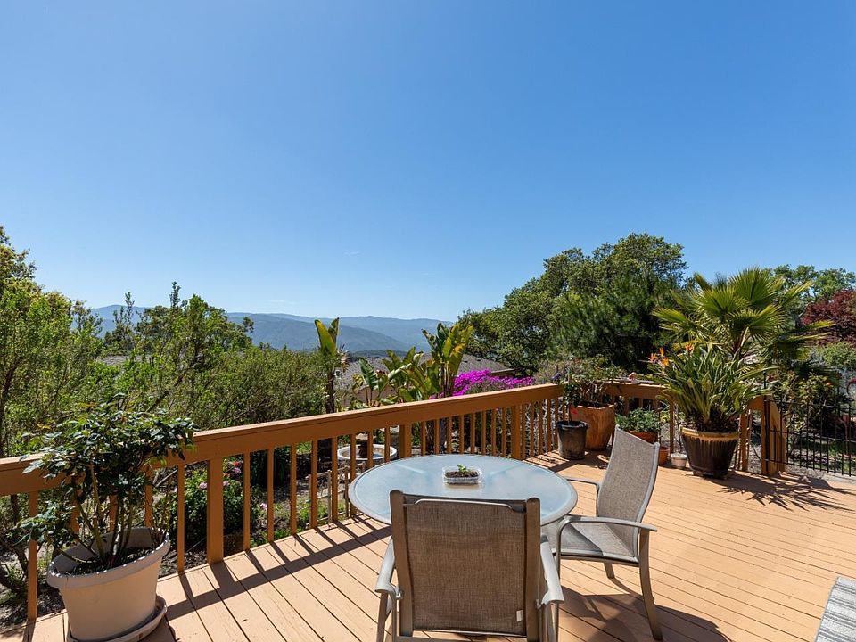 Located at the top of Laureles Grade with floor to ceiling glass and oversized windows, this home offers panoramic views of the Santa Lucia Mountain Range, the valley, vineyards and the Pastures of Heaven. The private, corner lot in an upscale neighborhood is planted with fruit trees, including pears, loquat, cherry, concord grapes and more, along with raised bed gardens all on an automatic irrigation system. There are two outdoor living areas, one in full sun and one in the shade of old oak trees. Inside, all floors are hardwood or tile, and the bedrooms are large, and have been updated with new tile and fixtures. The kitchen has views of the mountains, a new refrigerator and induction stove. The garage has been improved for use as an artists work shop with skylights, large windows with an abundance of natural light and a magnificent view. Local beaches, downtown Monterey, Garland Regional Park, Carmel-by-the-Sea, Big Sur and both Highways 1 and 101 are all within a 20-minute drive.