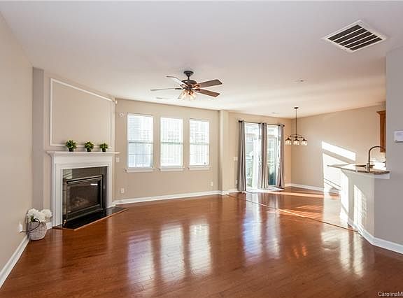 This beautiful end-unit town home is the sought after Stetson model with downstairs den/office. Beautifully maintained and fresh paint in main living areas. Wood floors throughout main level. Extra large patio makes it easy to entertain guests and enjoy the outdoors. Kitchen has lots of storage space, granite counters, S/S appliances, breakfast bar, and walk-in pantry. Great room is spacious with ceiling fan and gas fireplace. Large master suite boasts a tray ceiling, large walk in shower, double sinks, and extra linen closet. Two good size bedrooms and laundry upstairs. Excellent Ballantyne location! Walk to Waverly - stores, restaurants, and entertainment! Easy access to 485!