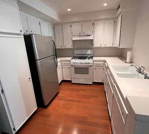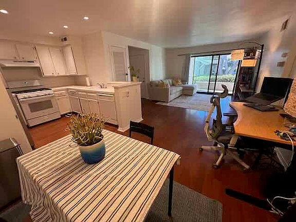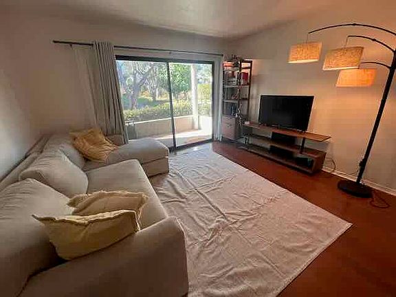 Excellent location, first floor, 791 ft. , one bedroom, one bath condo. Wood laminate in the living area, tile floor in the bathroom, and carpet in the bedroom. Sliding glass door to patio that looks out on a large beautiful landscaped pond. The picture shown in this listing was taken in front of the unit. Two closets in the large bedroom and another closet at the entry. The property has a resort-like feel with ponds and streams throughout. Lighted tennis courts, pool, spa and clubhouse, and barbecue "surrounded" by an another spectacular pond. Washer/dryer, refrigerator and stove included. One designated carport space with storage cabinet and plenty of additional parking. Water and trash included in rent. Great access to freeways, shopping, theaters, etc. One year lease. The owner pays for water and trash. Tenant is responsible for all other utilities. Small pet may be considered. In addition to the security deposit, there will be a $500 cleaning deposit due upon signing the lease.