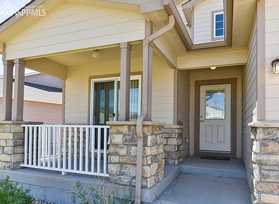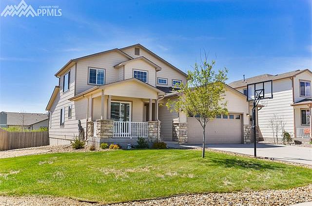 Beautiful family home in move-in condition! Walk up to the welcoming covered front porch to relax and enjoy the Colorado evenings. As you enter the home you see the gorgeous wood floors throughout the living area. The Great Room has vaulted ceilings and lots of light, opens to the dining room and kitchen and walks out to the back deck. The kitchen boasts granite countertops, custom tile backsplash, tile flooring, counter seating, stainless steel appliances with a double oven, tons of cabinet space and an eat in area that walks out to the front. The main level Master Suite has a walk-in closet, an attached five piece bath with granite counters and countertop basin sinks the bedroom walks out to the back deck. Also on the main level is the laundry room and a half bath. The garden level basement features a second family room, a fourth and fifth bedroom, a full bath and a storage area. The covered deck leads down to a dog run area, a large level, fenced yard and an additional seating area making it a great outdoor entertaining space. The home also has a three car garage, air conditioning and access to the Woodmen Hills Recreation Centers with fitness facility and both an indoor and outdoor pool.