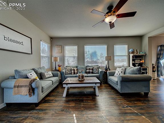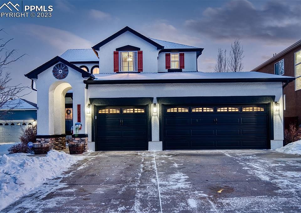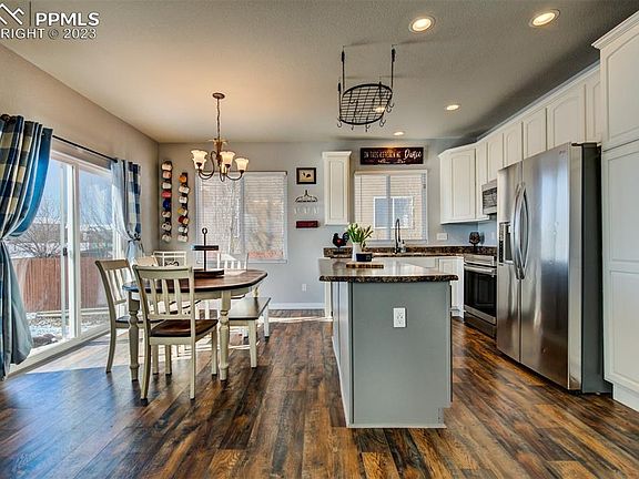 Spacious and well maintained home available in desirable Meridian Ranch. Upon entering the home, one is greeted by an open floorplan with abundant natural light that flows from the main living room to the kitchen and dining area. Refreshed and ample 42" kitchen cabinets and SS appliances stand out against the new LVP. A gas fireplace, the guest bathroom and separate laundry room complete the main level. En route to the upper level one will find the primary suite, an expansive room with a coffered ceiling, 2 separate closets and a 5-piece attached private bathroom. There are 2 additional bedrooms with a shared bathroom and extra cabinet space in the foyer which fill out the rest of upstairs. Downstairs in the finished basement one will find a second living area, the fourth bedroom and full bathroom, and an additional storage closet. The fully landscaped front and backyards will be sure to please with newer sod in place, a pond, and a concrete patio. Backyard backs to The Greens Park. The 3-car garage with a built-in workbench and deep, fixed storage shelving gives generous storage. The rec center is just a few blocks away and ready to entertain with pools, splash pad, and fitness rooms. Antler Creek golf course & clubhouse is 6 blocks away. Virtual tour is available. This updated home has mountains of opportunities for you to make it your own!