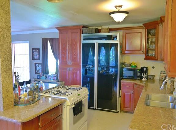 (Seller's description)1050 sq feet and 2nd living area (living room) approx 400 feet with new bath room sink. Plus a large patio cover, RV access. New full Kitchen with customized built to fit cabinets fridge and new slide in oven. Dual panels windows for entire house. Garage is used as 4th bed room with dual panels ceiling windows, and includes a full bath room with carpet. Carpet can be removed if new owner wants garage space only .There are a huge orange, grapefruit and as well a huge fig tree with a very nice fire pit in the backyard.