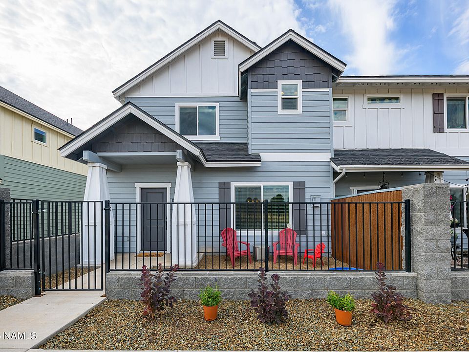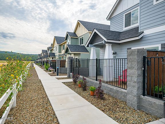This beautifully finished townhome is situated on one of the most desirable lots in the community. Bordering the Coconino National Forest, enjoy miles of trails, endless pines and views of the San Fransisco Peaks directly from the front porch. This 2021 build features modern touches and a thoughtful floorplan, one of the largest in the community. The main level hosts a spacious living room with gas fireplace, a large kitchen with quartz countertops, breakfast bar, stainless appliances and a walk-in pantry. The upper level features a large loft perfect for a home office or secondary family room. The primary suite offers mountain views, a gas fireplace and an ensuite with a custom walk-in shower. Two spacious bedrooms offer guest privacy. Check out the community park and pickle ball court!