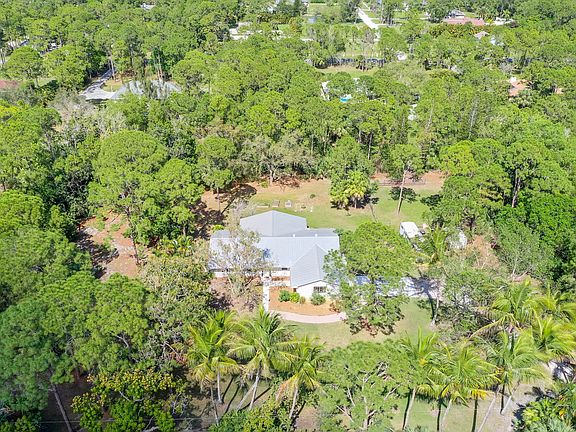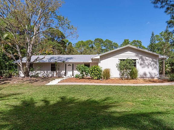Beautiful & well maintained 3BR/2.5BA + office home sitting on a huge (over 2 acres) tropical & peaceful lot in Jupiter Farms. The open floor plan features a gorgeous, remodeled kitchen with newer appliances including a GE propane range, solid wood cabinets, and granite countertops, plus updated bathrooms with newer granite countertops. The oversized screened backroom is perfect for entertaining plus there are two patio spaces, one screened-in area directly off the living room, and another 425sf wooden deck is right off the primary suite. The backyard has been landscaped with fruit trees and room for a pool, offering desirable serene garden views. The lot is completely fenced and private with an electric gate at the entrance, plus a new metal roof was added in 2016 along with gutters