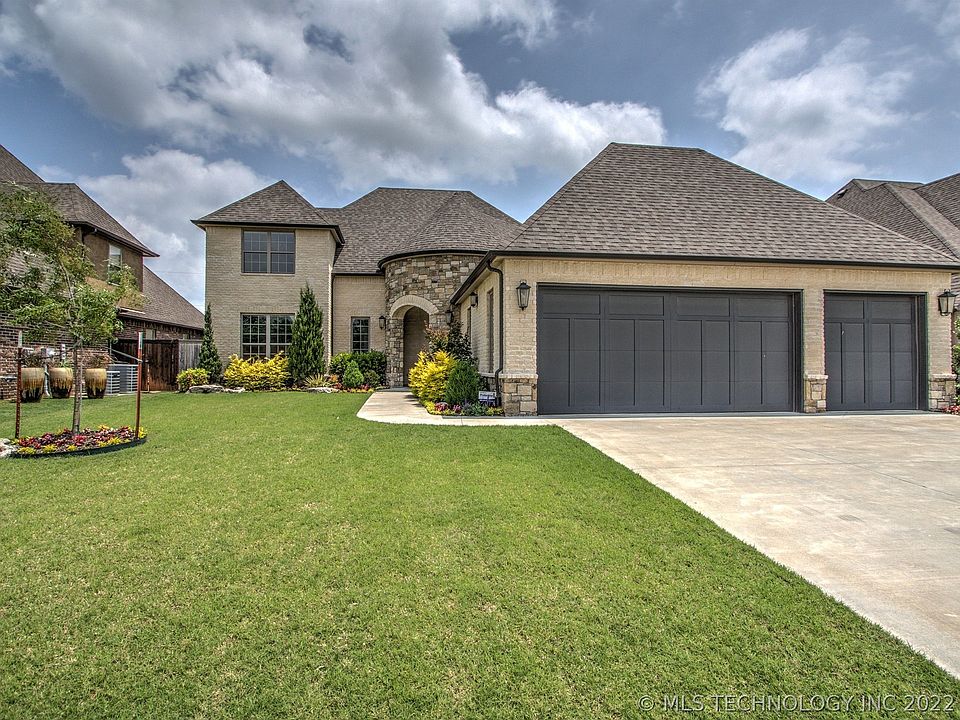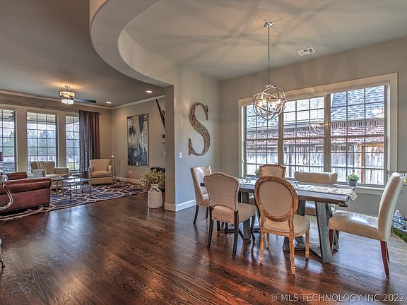 Fabulous custom w/transitional finishes w/wooded views! Perfect for entertaining w/dual dining room opens to Great room, wood floors, warm fireplace, large windows, custom arch ways. White kitchen, stainless appliances, extra large breakfast bar, large pantry. Open & roomy for entertaining.
