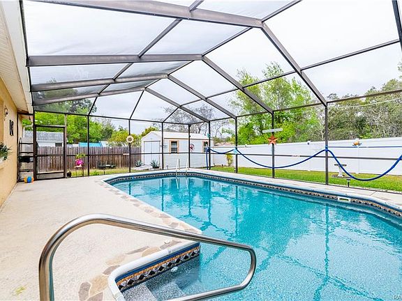 Step onto this inviting property and immediately feel at ease as a wide paved driveway guides you to the spacious two-car garage, framed by an open front yard and a charming raised oval garden bed filled with light-colored rock for a clean, polished touch. A front walkway doubles as a welcoming porch and leads into a bright foyer with tile flooring and a textured ceiling carried throughout the main living spaces. To the right, the generous living room features warm wood-like floors and is brightened by two tall windows that fill the room with an open, welcoming ambiance. The adjoining kitchen offers tile floors, stainless steel appliances, solid wood cabinetry, multicolored tile backsplash, solid countertops, and a convenient breakfast bar that makes everyday routines feel effortless. Just beyond, the dining area continues the smooth flow of the home with coordinating flooring and sliding doors that open to the screened porch and pool area, creating easy indoor-to-outdoor living. To the left of the foyer, two well-sized bedrooms—each with attractive plank-style floors and their own walk-in closets—provide flexible space for guests, hobbies, or remote work, with one currently arranged as a semi-office. The second bathroom sits close by with a single vanity and a step-in shower. Positioned near the kitchen at the mid-section of the home, the primary bedroom offers a peaceful retreat complete with matching flooring, multiple walk-in closets, and an en suite bathroom featuring a glass-enclosed step-in shower and a window that brings in soft, natural brightness. Step through the rear sliding doors into the screened porch with outdoor tile flooring—an inviting place for morning coffee, evening chats, weekend lounging, or casual gatherings. Just beyond, the screened heated pool offers year-round enjoyment, whether you're relaxing after a long day or spending sunny afternoons floating peacefully. The backyard includes a storage shed and a durable white vinyl fence that adds privacy and a clean, finished look. Nearby attractions include Weeki Wachee Springs State Park with its stunning spring waters and river adventures, SunWest Park featuring a lagoon-style beach and water activities, and the Nature Coast Botanical Gardens with peaceful walking paths and lush scenery—adding even more charm to the lifestyle offered by this welcoming Florida home.