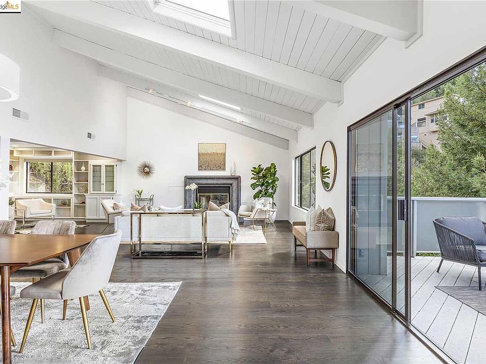 This modern home has splendid bay views from both levels. There is a huge great room dining room/living room with huge fireplace/den combo, enormous eat-in kitchen, awesome master suite with huge media room with wood burning stove, two additional bedrooms. 2 car garage. Not far up the hill from Claremont. Great location for commutes, Elmwood and Montclair and Rockridge.
