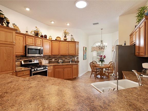 Location! Location! Location! This nicely appointed GARDENIA in the Village of SUNSET POINTE may just be the home that you've been looking for! Just steps to the Lake Miona Regional Rec Center and minutes to Lake Sumter Landing, this home boasts an 11000+ square foot cul-de-sac lot with no backyard neighbors and room for a pool! The spacious eat-in kitchen features stainless appliances and gas cooking! The huge master bedroom offers two walk-in closets and a large master bath with dual sinks! If you prefer a home without carpet, there's none here! Looking for a split bedroom plan? Check, got that too! Even the third bedroom has a closet - not typical of most Gardenia's! Huge screened in lanai overlooks the private yard and a natural hedge fence. Walk around the hedge fence and you are at the Lake Miona Regional Rec Center! Last but not least, the BOND IS PAID!
