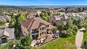 Welcome to a stunning residence offering a sophisticated & luxurious lifestyle with views of Downtown Denver. The home is located on 6th hole of the Golf Course. Homes of this size, quality of craftsmanship and style are hard to come by. A 4-car garage provides space for all your vehicles and toys. The gourmet kitchen is a chef's dream, boasting high-end stainless-steel appliances & custom cabinets. The large kitchen island provides plenty of seating, making it perfect for casual meals or hosting gatherings with friends & family. The main floor study is an ideal space for a home office or library, with fireplace and access to outdoor patio. The master suite is a private retreat, featuring a spacious bedroom, en-suite bathroom with heated floors, & a balcony with Downtown Denver and Golf course views. Upstairs, an additional living room/flex space awaits you, providing a perfect space for relaxation, entertainment or 2nd office. There are three additional bedrooms upstairs. One with en suite bathroom and the other two bedrooms share a bathroom. The finished basement is a haven for entertainment. The large recreational room has a bar and wine cellar. Two additional bedrooms can flex to exercise room and craft room. There is a large storage room, or transform this extra space into a theater room! Step outside to the patio & you will discover a backyard that is an outdoor enthusiasts, dream. It provides multiple spaces for gathering and relaxing. A warm and inviting fireplace allows you to enjoy the outdoors and views year round! This home is a one-of-a-kind property that offers a combination of luxury, comfort, & tranquility and is waiting for you to start making memories here!