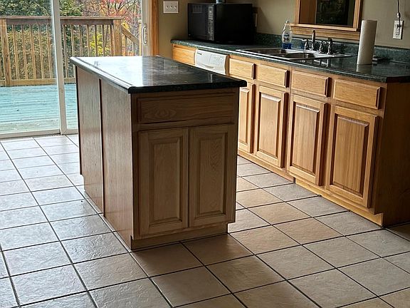 - Description: oak cabinets, island, ceiling fan, tile floor