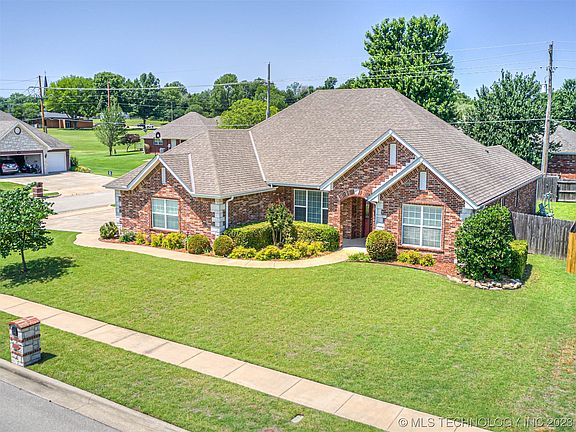 If GREAT condition is on your list of must-haves, then this property is for you. This immaculate 1-owner home has been gently lived in, and it shows! Many walls have never had a nail in them, and the appliances were infrequently used...a well loved and respected home that feels just like new! All rooms are spacious, measurements of main rooms are available. You'll appreciate the quality touches, such as the full front porch, beautiful transom and sidelight windows at entry door, and handsome trims and moldings throughout the home. Formal dining has bank of windows, real wood flooring, and beautiful contrasting paint. Kitchen has granite countertops, eating bar, pantry, SS gas cooktop, wall oven, microwave, with breakfast nook. Large, open living room has corner gas fireplace. Upon entering the house from the garage, there is a half bath and a separate coat and shoe cubby with bench. Utility room is separated and spacious, with folding and hanging spaces, sink, and abundance of cabinetry. Primary bedroom is very generously sized, with tray ceiling and private bath. Primary bathroom is so well appointed, with separate tile shower, whirlpool tub, two vanities separated by full length cabinets for additional storage. Primary closet is a dream! The additional bedrooms all have walk-in closets, and are very spacious. Side entry 3 car garage adds to the wonderful curb appeal. Stand-up storm shelter in garage remains. Corner lot provides opportunity for access to the side and back yards.