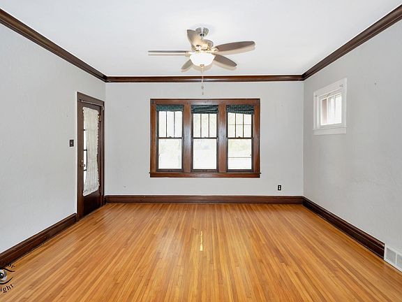 All brick, vintage home features original narrow plank hardwood floors, crown moldings and arched doorways that complete the classic look. Two main floor opposed bedrooms with a built-in hall linen closet and laundry chute. Modern, all white kitchen with built-in spice cabinet. Lots of potential with the walk-up attic for storage or possibly expanding the living space. A clean, dry basement offers many additional possibilities and storage options. The driveway is located off the main street for easy parking and garage access. The large double lot is well maintained with plenty of area for recreation, landscaping and gardening. Convenient location.
