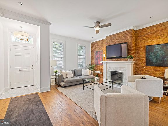 Welcome to this stunning Logan Circle row house with a gorgeous renovation, terrific front and rear gardens and two-car tandem parking. The front stone patio provides room for a table of six. Step inside this urban oasis to find tall ceilings, custom moldings, hardwood floors, and an inviting traditional floor plan. Historic charm remains thanks to details like the original banister and newel post.The living room is adorned with an exposed-brick wall, marble fireplace and slatted window treatments which are found throughout the home. The separate formal dining room boasts elegant custom wainscoting and crown molding. The chef's kitchen, fully updated with a Bosch stainless-steel appliance suite and custom built-in cabinetry, is found down the hall past the coat & storage closet under the stairs, a spacious powder room, and the laundry closet. Out the back door is a secure tandem-parking area for two cars. Enhanced with brick pavers and custom landscaping, this area also provides patio spaces for relaxing or entertaining. Upstairs by the landing find a beautifully updated hall bathroom and rear bedroom with a roomy closet and additional storage cabinets above. The middle bedroom, with three full closets and upper cabinets, hosts a queen bed and office. The spacious primary bedroom crowns the home with its private marble bathroom, sitting area and multiple closets. This wonderful residence is nestled in one of DC's most vibrant neighborhoods close to endless dining, shopping and entertainment options. Enjoy the best of city living at your doorstep!