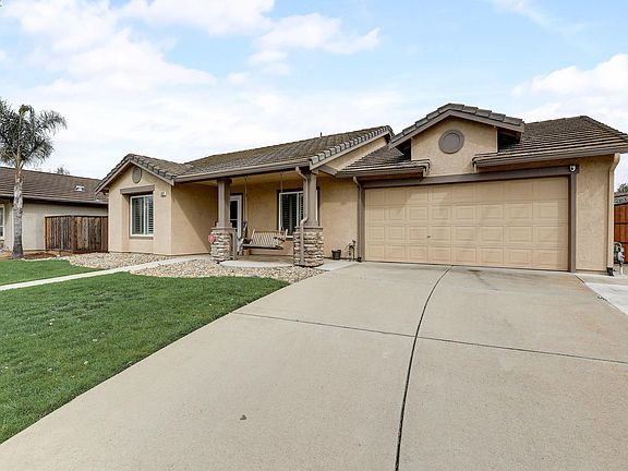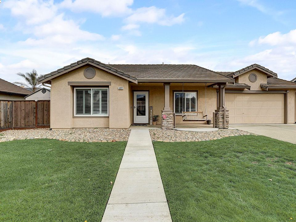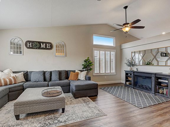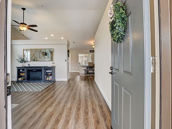 Welcome to this beautiful and updated single story home nestled in a cul de sac. Upon entering, you will be greeted by an abundance of natural light in the spacious living and dining area with vaulted ceilings and durable luxury vinyl plank flooring that runs throughout the home. The open concept kitchen complete with updated counters and functional kitchen island is an ideal gathering place for all. The kitchen opens up to a spacious, low maintenance backyard, complete with a covered patio and ceiling fans to keep you cool on those hot summer nights. Make sure you don't miss the spacious side yard! Back inside, the primary suite also opens up to the backyard, and features a gorgeous en-suite. The bathroom has been updated with designer features including custom black tile work, champagne gold fixtures and a custom counter with dual sinks that will definitely impress. Both secondary bedrooms are spacious and filled with natural light. Be sure to ask about all of the extra features such as solar, battery back up wall, smart irrigation controls, smart thermostat and Ring cameras.