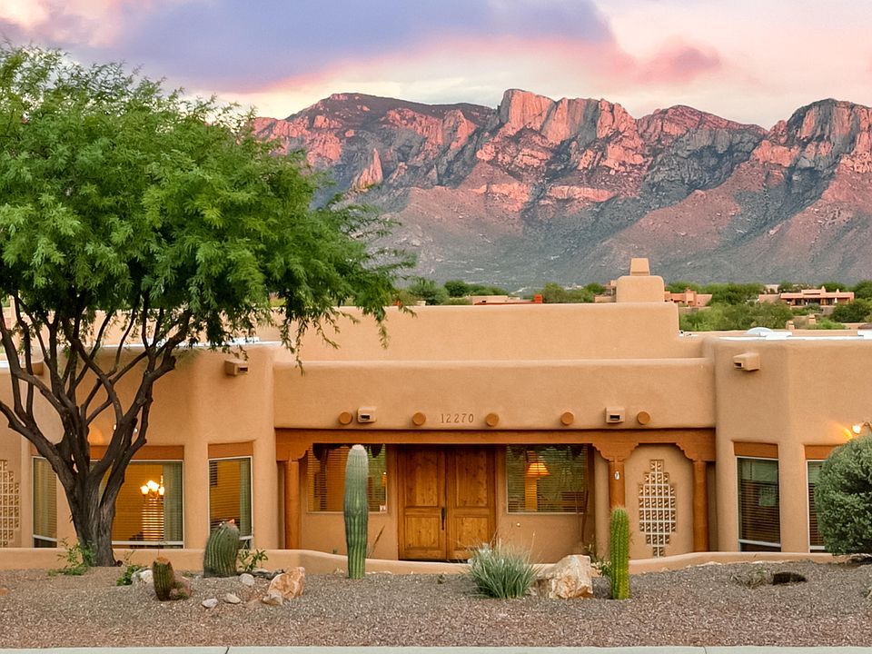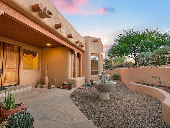 Open the door to the most amazing and unparalleled views in Oro Valley. Perfectly situated on 1.38 acres this architect designed, custom built New Mexico styled Pueblo residence offers privacy and the most spectacular mountain and desert vistas. A flagstone walkway and fountain invite you on entry. Double doors open to a great room with soaring ceilings that lead to a 40ft tile covered patio with panoramic mountain views. The great room features viga beams, a gas fireplace and built in entertainment niches and flows into the gourmet kitchen that is equipped with a Sub-Zero refrigerator, cherry cabinets, granite tile tops, Dacor 5 burner cooktop, KitchenAide convection/microwave stack, Bosch dishwasher and a casual dining area with travertine floors. There is also a large dining area if you