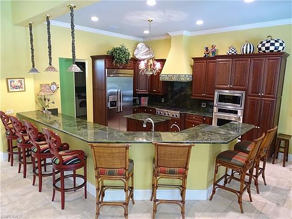 Beautiful 3 bedroom plus den/3 bath with den is located in the prestigious picturesque gated community of The Verandah. Sits on a premium lot overlooking the Orange River. Has over 5000 total square feet including Lanai with an open floor plan and vaulted ceilings. Spacious kitchen with Thermador stainless steel appliances and a fabulous 6 burner gas range that any chef would be proud to cook on, wine fridge, and 2 drawer u line echelon cooler. Brand new furnace and condenser with a 10 year warrantee. New smoke detectors with 10 year battery life. Beautiful covered Lanai that houses a pristine custom swim up heated pool with automatic pool filler and spa. New pool pump and filter system. Enjoy 9 miles of walk/bike trails; fitness center; 5 Har- true tennis courts, great restaurant and bar, dog park, and wonderful resort style community pool. Optional membership to two champion golf courses.