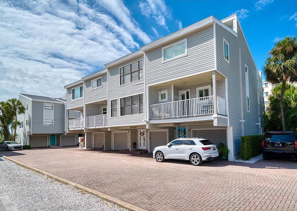 You must see this private and pristine 8-unit townhome community located directly on the Gulf of Mexico and tucked away amidst palatial waterfront mansions! Full time or part time residents or vacationers will enjoy the stunning sunsets while teasing their toes in the Gulf sands. The ground floor unit consists of an enclosed garage and a separate bonus room that leads to a private fenced yard graced by easy-to-care-for landscaping. Through the front entry you will ascend to the first floor living area where you will find the living room, dining room, kitchen, eat-in breakfast area and a full bath with a 4 jet Whirlpool spa. A wood burning fireplace is currently capped but easy to revert to its natural state. Kitchen with granite counters, French door refrigerator and stove, microwave, glass-top range and dishwasher allow for easy beachfront living. The breakfast bar has room for four.. From this level you will enjoy the outside composite deck overlooking partial views of the Gulf of Mexico- enough room for a full-size table and chairs for those intimate dinners. A brand new larger spiral staircase gives access to your fenced-in patio. Up another level is the master suite and bath, guest bedroom and another full bath. Another composite deck off the master bedroom gives you more fantastic views of the Gulf. The third bedroom is up another level on the third floor, perfect room for a teenager or more guests. Roof replaced 2021, hot water heater 2020, reverse osmosis system, and a whole house water filter. Ground floor level (garage and bonus room) is uninsurable. Close to everything – less than one mile to Johns Pass for great restaurants, shops, boating and entertainment. So much to do in Treasure Island!