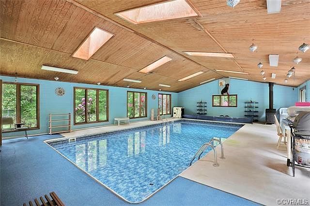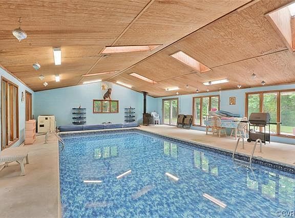 That's right!! Year round swimming!! Just listed on the internet today, Friday, November 9th. Sits off the road privately up Sassafras Hill but has lots of road frontage on Rt 301 (Hanover Courthouse Road if you like the idea of operating a home office. 30' x 18" inground indoor heated pool! The pool room has a vaulted ceiling skyights and is separate from the home square footage but it is attached to the home! On other side of this long brick rancher is a four (4) car garage with one bay built to accomodate a large RV or Boat, etc! 6.35 acres of privacy overlooks beautiful nature views and ravines. Nice yard area with giant rear patio. Deep artesian well. Assessed at $519,000. Needs some floor coverings and decorating and priced agressively. Better hurry on this one. Contact Exlusive Agent.