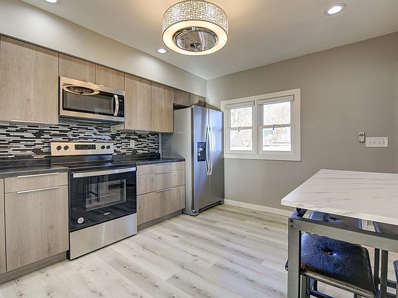 CAPTIVATING NEW KITCHEN WITH STAINLESS STEEL APPLIANCES!!! Three bedroom features beautiful hardwood floors, fresh paint and modern fixtures throughout. Dinette set and electric fireplace are negotiable with an acceptable offer. Lower level affords 2nd bath and laundry. Level backyard enclosed with a new white vinyl fence. Home is a complete remodel; roof, siding, windows, HVAC, electrical, plumbing, water proofing system, exterior doors and so much more! Make this house your new home!