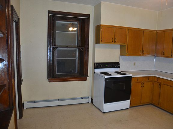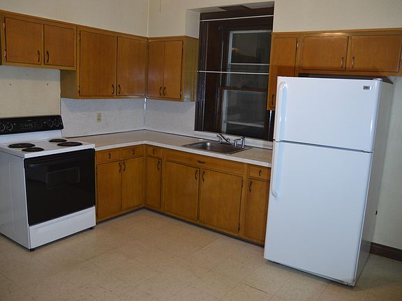 The apartment is the first level of a brick 3 level. It includes a living room, 1 bedroom, 1 bathroom and a large kitchen with a walk in pantry area. The water heater and heating system are both natural gas. The kitchen includes an electric stove and refrigerator. The walk in pantry could also be used as a small office. The basement has a private storage area with laundry hookup. Ceiling fans are also included. Please call the number listed. Tenants pay all utilities. Lawn care and snow removal is included in the rent. A Credit check, references, and one month security required. No smoking and no pets are allowed. Plenty of off street parking in the back close to the building.