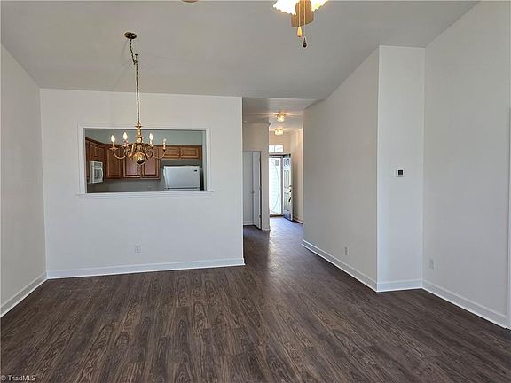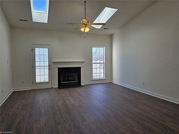 This end unit townhome in Kernersville is off Salisbury Street, near downtown, shopping centers, restaurants, recreation center, BeesonParkSportsComplex, and hospital. The neighborhood has both single-family homes and townhomes. The property features a covered entry, a two-car garage, new vinyl plank flooring, and fresh painted walls throughout. The HOA covers roof replacement (recently done), lawn care, and other services. The HVAC system was installed in April 2023 by Blackburn Carter. The refrigerator and recent dishwasher are included. The den has a vaulted ceiling with skylights, making it bright and airy. It’s combined with the dining area, and a kitchen pass-thru window opens to the living area, which features a gas log fireplace. The primary bedroom is spacious with large windows for morning sunlight, and the primary bath includes dual sinks and separate shower. The 2nd bedroom, main bath, and laundry are at the front of the home. There's also a double garage and driveway.