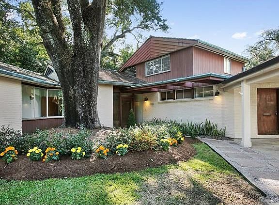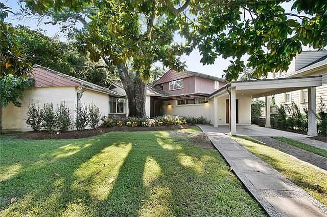 Extraordinary Mid-Century Modern Garden District home blocks to Commander's Palace, streetcar, Magazine shops & restaurants, parade routes. Generous lot w/ 200-year-old oak tree & luscious backyard. 3 bed/3.5 bath. Original details include fabulous open wood staircase, built-in bookcase/storage, retro bath fixtures, large sliding glass doors overlooking lush backyard. Grand living/dining area opens to screened-in patio perfect for entertaining. Whole house generator. Carport & off-street parking for 2 car