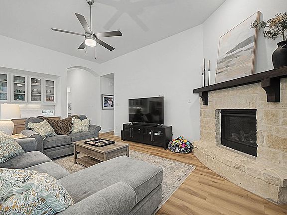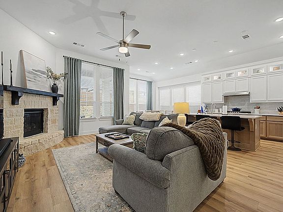 Better-than-new Highland Home in Rockwall ISD! Move-in ready with upgrades, natural light, and a prime location near the front of the neighborhood. This spacious one-story features an open-concept kitchen, dining, and living area designed for everyday comfort and easy entertaining. Tall windows bring in abundant natural light, while 11’ ceilings and 8’ interior doors create an airy, elevated feel throughout. The living room is anchored by a beautiful stone fireplace, adding warmth and character to the main space.