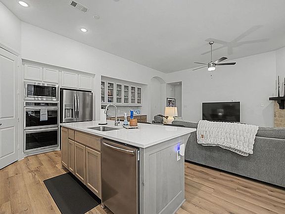 The upgraded kitchen is a standout with quartz countertops, a large island, gas cooktop, separate double ovens, stainless steel appliances, and extra upper and lower cabinetry for storage and prep space. A built-in hutch/coffee bar with backlit glass-front cabinets adds both style and functionality.