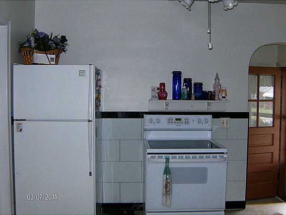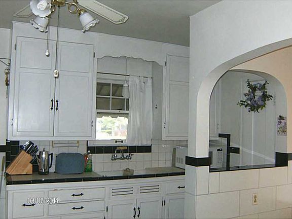 Wonderful bungalow w/arched doorways, hardwood floors & beautiful stained trim & doors. White kitchen with tiled counter tops, pantry, appliances, and cozy breakfast nook. Large dining room & great room w/arched doorway & hardwoods under carpet. Covered front porch plus open patio off of dining room. Full brick exterior with fenced back yard, mini barn, & 2 car detached garage. Full basement offers lots of storage & a finished 19 ft rec room. Home Warranty included.