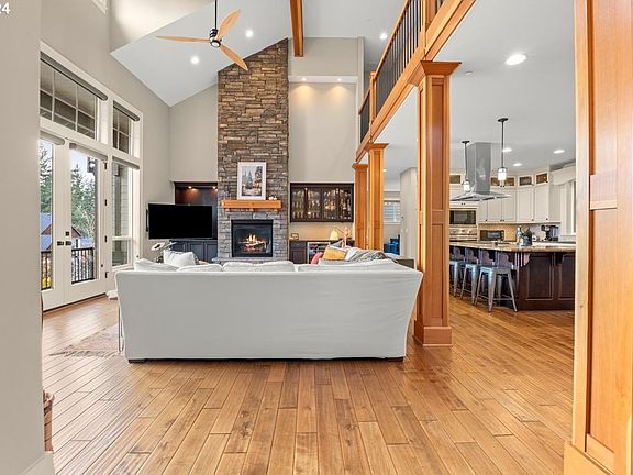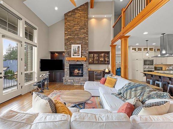 This spacious home is perfect for both entertaining and family living. Surrounded by like homes on a quiet Cul-de-Sac backing to farm land. It features a large, open-concept living area with soaring ceilings, fireplace, wine cooler, built-ins and balcony. Main-floor guest suite, and an office/den. The upper level includes the owner's suite and two additional bedrooms. With a six-car garage, a covered outdoor space, newly renovated upper backyard area with Turf and propane fire pit. This home offers plenty of room for storage, relaxation, and gatherings. Thoughtfully designed with privacy in mind, it provides easy living with functional spaces throughout. Located just blocks from New Seasons, coffee, and shopping. A must see!
