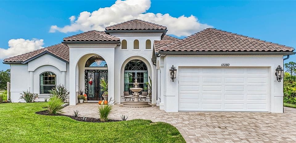 LUXURIOUS RESORT LIVING without leaving your home. **The Virtual Tour for this listing is A MUST SEE!!**Completed in 2021, this light and bright, Mediterranean style, custom-built home is located on an OVERSIZED CORNER LOT with NO HOA fees and NO FLOOD insurance required. This home offers IMPACT WINDOWS and sliders and ELECTRIC KEVLAR ROLLDOWN SHUTTERS across the 65’ lanai. As you step inside through the gorgeous 9-FOOT WROUGHT IRON AND GLASS DOUBLE ENTRY DOORS, you will be captivated by the spacious interior, meticulously adorned with impressive upscale finishes and an abundance of natural light that exudes an undeniable sense of luxury and comfort. The open-concept great room boasts an electric FIREPLACE and wood mantel inset on a stacked stone wall and 9-FOOT POCKETING SLIDERS that allow for seamless indoor/outdoor entertaining. The chef’s dream gourmet kitchen offers an abundance of SOLID WOOD dovetail cabinets with SOFT CLOSE drawers/doors and convenient pull-out wood shelving, EXOTIC GRANITE, GE Profile stainless smart appliances including DOUBLE WALL OVENS w/ AIR FRYER, INDUCTION COOKTOP, BOSCH DRAWER microwave, and a convenient pot filler. Just off the kitchen is a roomy breakfast nook overlooking the private backyard paradise. The master bedroom suite is a true escape with sliders leading outside to your own cozy lounge area. The suite also features TWO WALK-IN CLOSETS, an elegant ensuite with GLASS SINKS, an extra-large SOAKING TUB, a private water closet, and a MASSIVE WALK-IN SHOWER with pebble floor, bench seat, and several MASSAGING SHOWER HEADS. The guest bedroom and bathroom both have access to your outside oasis. The laundry room includes a SECOND PANTRY with pull-out shelves, an in-wall ironing system, and GE extra large capacity washer and dryer on pedestals with drawers for more storage. Other notable interior features include SOARING COFFERED AND TRAY CEILINGS, extra wide trim and crown molding, stunning crystal designer light fixtures, and 8-Foot doors with crystal knobs. Built to entertain, the custom layout of the home includes an area equipped with a stylish 8-FOOT POOL TABLE and dart board. The sprawling lanai boasts a sparkling 30-FOOT HEATED, SALTWATER POOL AND SPA, and an extra-large SUN SHELF. Entertain effortlessly and in style with multiple conversation areas, a comfy canopy swing, a glass stone fire pit, and a very well-equipped BUILT-IN SUMMER KITCHEN with a large granite island and a beautiful glass bar sink. The INSULATED AND AIR-CONDITIONED garage has plenty of steel shelving and finished walls; it can easily be used for ADDITIONAL LIVING SPACE OR A HOME GYM. Along the side of the home, is an attached 5’ x 17’, AIR-CONDITIONED STORAGE ROOM with double door entry. A few other impressive qualities of this home are a WHOLE HOUSE REVERSE OSMOSIS water system for amazing drinking and bathing water, an ON-DEMAND TANKLESS WATER HEATER, underground electric, full yard irrigation, beautiful palms, CEMENT BARREL-TILED ROOF, and a PORTABLE GENERATOR WITH A designated built-in outlet. As A Bonus, An ADJACENT LOT IS AVAILABLE with endless opportunities such as an additional garage, casita, or second home. *Most furnishings are also available outside the contract for a TURNKEY, MOVE-IN READY OPTION. Just a stone’s throw from Rotonda West with many golf courses. Minutes from several gorgeous beaches, multiple airports, great restaurants, and shopping. Don’t miss the opportunity…THIS HOME IS NOT LIKE THE OTHERS!