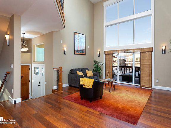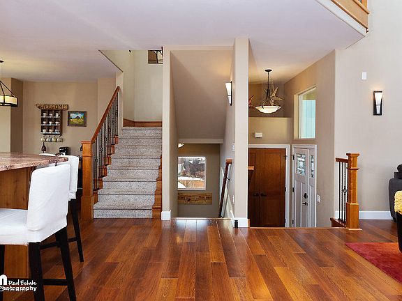 Beautiful South Anchorage home at the end of cul-de-sac with easy access! Enter front door into a living room with soaring ceilings and lots of natural light, a gas fire place, beautiful flooring and custom built-ins. Entertain your friends and family in the gourmet kitchen with stainless steel appliances, granite countertops, a pantry, large island/ breakfast bar and