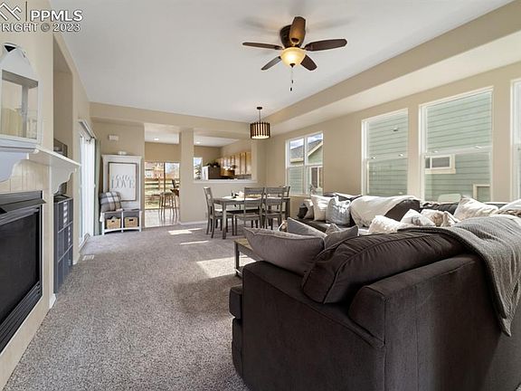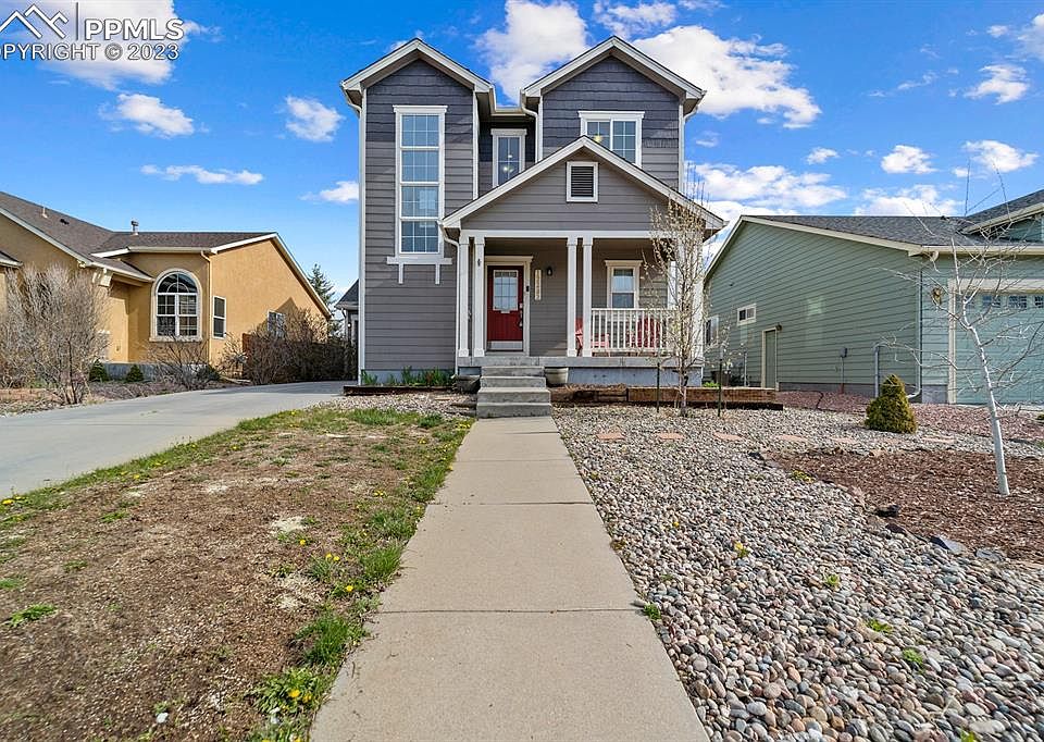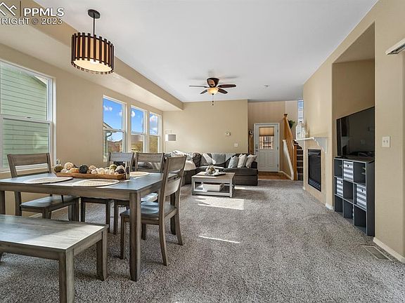 This delightful two-story abode offers 4 bedrooms, 4 bathrooms, and an attached 2-car garage, making it the perfect place to call home. Upon arrival, you'll be greeted by a charming covered front porch that invites you to step inside and explore. As you enter, the open concept floor plan an abundance of natural light creates a warm and welcoming atmosphere. The living room, complete with a cozy fireplace, flows seamlessly to the dining area and kitchen, providing an ideal space for entertaining and family gatherings. Walk-out access to the patio allows for effortless indoor-outdoor living. The kitchen is a chef's dream, featuring stainless steel appliances, and island with additional seating. The large windows along the staircase fill the space with sunlight, adding an airy ambiance throughout the home. Retreat to the spacious primary bedroom, adorned with an additional room perfect for a reading nook, nursery or dressing area. The ensuite bathroom offers a dual vanity and large soaking tub. Two additional bedrooms and full bathroom complete the 2nd level. The expansive basement offers a versatile area for living, recreation, or hosting guests, complete with an additional bedroom and full bathroom. Located catty-corner from the Meridian Ranch Recreation Center, you'll have access to a vibrant community with plenty of amenities including a gym and pool. Enjoy a leisurely walk to the numerous parks surrounding the Antler Creek Golf Course or explore shopping and dining options on Meridian Road and Stapleton Drive. Don't miss the opportunity to make this exceptional home yours.