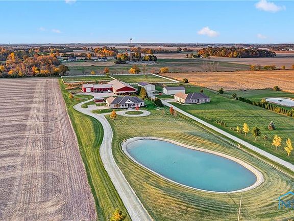 This custom brick ranch boasts 9 acres of country living perfectly located between Perrysburg & BG with easy access to I75. Vaulted ceilings, natural light, & gourmet kitchen are the center of the home with a primary suite separate from the guest wing. Built-ins in living & dining rooms add character. The main floor utility room includes a pantry. Enter the basement to find a living area, bar, room for exercising or crafting, two bedrooms, bath & storage. A horse enthusiast's dream fulfilled with indoor arena, 9 stalls, & tack room; plus a bonus barn apartment. Greenhouse doesn't stay.
