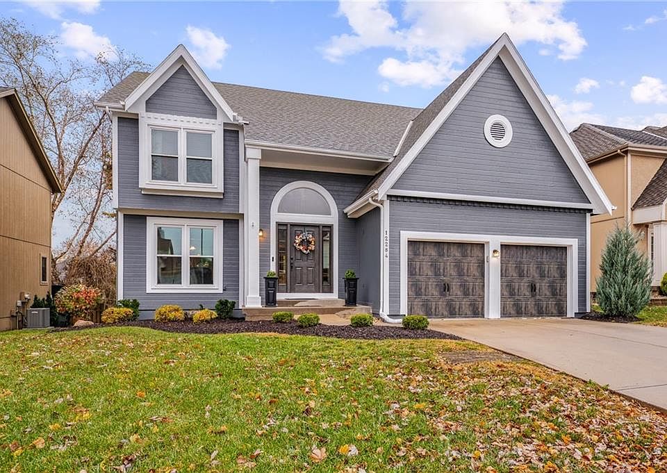 be HOME for the HOLIDAYS in this beautiful Heatherstone 2 story! Well-maintained & pride of ownership shows here, plus PRIME location conveniently located at 119th & Pflumm. ~ all the work's done here, just move right in! ~ upgrades include: NEW HVAC in 2017, NEW appliances 2023, NEW exterior paint & wood rot complete 2025, NEW main level triple pane windows 2025, NEW upstairs triple pane windows 2021, NEW front entry door 2021, NEW garage doors & openers 2021, NEW covered deck in the private backyard 2020, full basement remodel including windows in 2020... Main level includes formal dining + sunny breakfast room + formal sitting room + center island kitchen w/ granite & cozy gas fireplace in the living room. 4 spacious bedrooms upstairs & finished basement ~ entertain your guests at the wet bar & NEW brick accent decor on the walls in the movie room/tv room + workout room + half bath! Walk to the nearby elementary school!! don't miss it