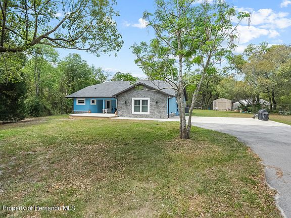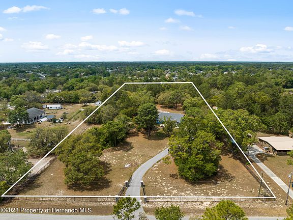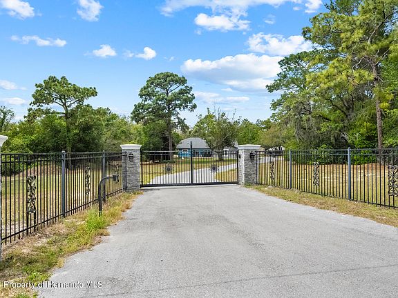 Welcome to your own private paradise! This stunning 4 bedroom, 2 bathroom home is nestled on 3 lush acres of fenced land, providing you with the peace and tranquility you've been seeking all while centrally located in Spring Hill in the 34609 zip code. As you enter the automatic gate, you'll immediately notice all of the curb appeal this home has thanks to stone details on the front of the house along with a large brick paver front patio, providing a warm and inviting welcome. This home has been meticulously maintained and updated, with a new roof and air conditioning system installed in 2022, as well as all new hurricane-rated windows. Enter into the open concept living and dining areas are perfect for entertaining, with plenty of natural light and featuring plantation shutters and luxury vinyl plank flooring. The spacious kitchen is a chef's dream, featuring a gas stove, gorgeous granite countertops and 3 pantries for all your storage needs. The primary bedroom suite is spacious and features two walk-in closets. You will be blown away by the master bathroom with a soaking tub and walk-through shower. In addition to the main home, this property also boasts a large shed (with power) for all your storage needs, as well as a dog pen and chicken coop for your furry and feathered friends. You'll love spending your afternoons relaxing on the covered porch, enjoying the peace and tranquility of your 3 acre property. Located in a central location, this home provides easy access to all the amenities you need, while still offering the peace and privacy you crave. Located just minutes from the Suncoast Parkway putting you to Tampa in under 40 minutes. This property is zoned agricultural with NO HOA and is located on a paved road with high-speed internet available. Don't miss your chance to make this beautiful property your own!