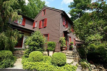 Croweswing is an enchanting farmhouse compound in a magical setting of verdant woodlands dotted with specimen plantings high on the south side of Jericho Mountain. Sited down a long organic allee, the house is perched regally upon a knoll at the apex of its circular drive and formal boxwood garden. Formerly owned by the founder of the Copacabana in New York City and most recently reinvented by a renowned interior designer, there is drama in its formal foyer with a black granite and Thassos glass floor and one of a kind entry lounge. The dining room with beamed ceiling and decorative fireplace has access to a sensational patio with hand stacked stone walls. The handsome country kitchen is warm and welcoming with rich hued painted cabinets and panels of exotic flambe wood and features stunning verdigris leathered granite counters, center island, a breakfast area for casual dining and divided light windows overlooking lush grounds. An oversized living room is an ideal gathering place as well as quiet retreat. Two upstairs bedrooms have private baths and walk in closets. A second floor guest apartment with outside entry contains a living room, full kitchen, bedroom and full bath. A multi storied barn (plumbed, heated & cooled) offers two first floor finished rooms, a powder room and several flexible spaces on the upper levels. Through a gated passage and stone stair sits an in ground pool and pool house complete with a window walled entertaining space, full bath and kitchenette. Some areas could use some TLC. Truly a rare property reflecting the uniqueness of Bucks County's artistic roots.