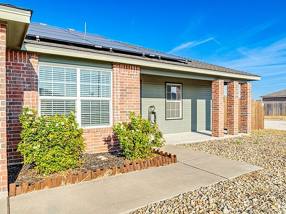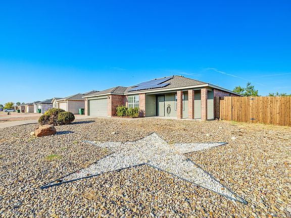 Welcome to this nice 3-bedroom, 2-bath home situated on a desirable corner lot! Featuring a spacious open-concept living area and split-bedroom floor plan, this home offers both functionality and privacy for modern living. Enjoy cooking and entertaining the kitchen, complete with stainless steel appliances, a farmhouse sink, and a quaint dining area perfect for cozy meal or hosting guests. Step outside to a zeriscaped front yard for low maintenance curb appeal and a covered front porch ideal for relaxing. The covered back patio is perfect for outdoor gatherings, and the privacy fence adds security and seclusion. Additional features include vinyl flooring throughout main areas, extra storage space, and solar panels paid off at closing for enhanced energy efficiency and reduced utility costs. Don't miss the opportunity to own this energy-efficient, move-in-ready gem that blends comfort, style, and practicality. Call your favorite realtor to schedule a showing. More pictures coming!