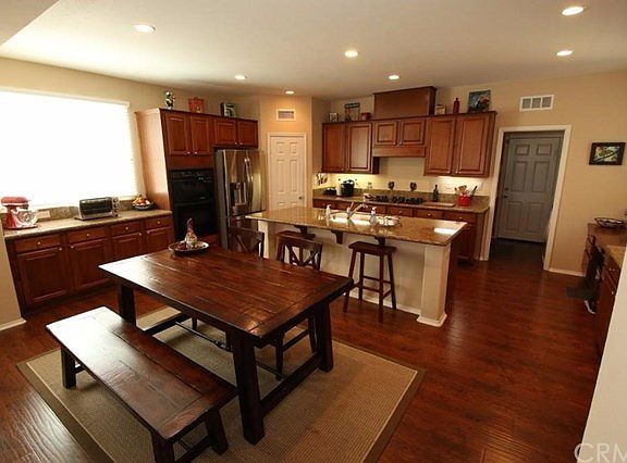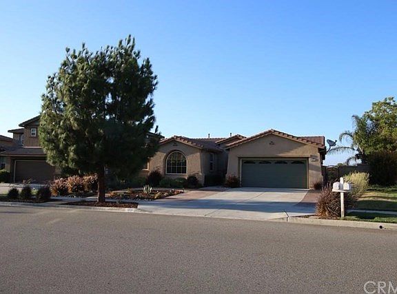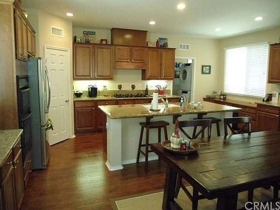 This is a fantastic one story home that features a massive kitchen with granite counters, kitchen island w/bar seating, walk in pantry, 5 burner gas stove, and wood laminate flooring. There is a large family size eating area that opens to the family room. The living room is also open to the family room creating a huge great room. The windows are all dual paned and nicely appointed with blinds and curtains. The great room has plenty of natural light and wood laminate flooring. There are 4 bedrooms that were all painted and recarpeted in 2012. The master bedroom features a separate shower and tub, double sink, private toilet room and walk in closet. The walk in closet has built in shelves, drawers and shoe racks that all pull out for easy use. All BRs have ceiling fans and there is dual zoned AC. The yard features drought resistant landscaping and water saving irrigation systems. There is an avocado tree, valencia orange tree and lemon tree. The patio is covered and provides a nice area to BBQ and relax. The 2 car garage is oversized. There is a separate laundry room and it has a nice counter space and utility sink. You will notice that this home is meticulously cared for and well maintained. It is truly turnkey and ready for you to call home!