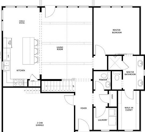Powder Room, Laundry Room & 2-car garage finish out the main floor. Estimated completion March 2023.