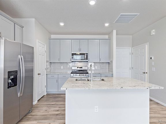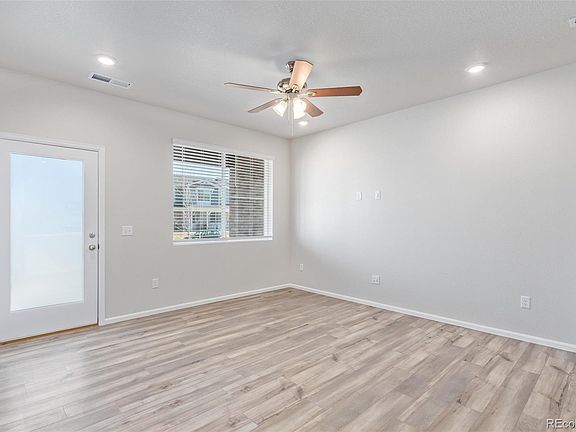 Why wait for a new unit to be completed? This brand new townhome is vacant and ready for immediate move-in. The inviting front porch welcomes you into an open floor plan with gorgeous LVP flooring. The upgraded kitchen is light and bright with gray and white finishes, granite counters, and a full stainless steel appliance package including a gas stove. Recessed lighting and ceiling fans throughout. The primary suite includes double vanities and a large walk-in shower, and a walk-in closet. There's a convenient upstairs laundry room - no hauling laundry up and down the stairs! Plenty of storage in this home too, with large closets and a kitchen pantry. The oversized 2-car garage with opener offers additional storage. This home has a great location with open space at the end of the street that will not be developed. This community offers low-maintenance living in a desirable location with super-easy access to I-25 and shopping.