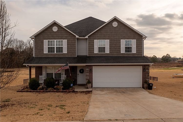 OPEN, ROOMY AND READY FOR YOU! Take a look at this property with country feel yet close to Town on a 0.36-acre lot with great views located just off Hwy 62, close to shops, restaurants, schools and Fayetteville! Exterior offers brick, covered porch to enjoy your morning coffee on and large yard with wrought iron fence to play in and gaze at the trees! Interior features floorplan that is perfect for entertaining with inviting living and family rooms with crown molding, large kitchen eat-in area perfect for your holiday gatherings, big granite island, granite counter tops, great cabinet space, walk-in pantry, half bath, laundry room and closet under the stairs; bonus room or a second living room upstairs, owner's suite with full bath with dual vanity, soaking tub and walk-in shower, three guest bedrooms and full bath, wood ceramic tile and carpet flooring! Call today to tour it and make it yours!